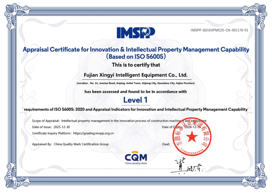 Fujian Xingyi Intelligent Equipment Co., Ltd. has been awarded the ISO 56005 "Innovation and Intellectual Property Management Capability" Level 1 certificate by CQM Standards & Certification Group Co., Ltd.